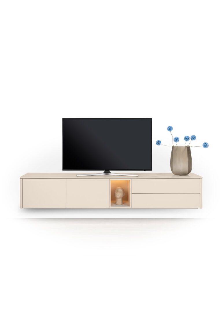 Een modern serie uitgevoerd in strak MDF lak is de TRENTINO serie. Hiervan is oa dit lowboard, verkrijgbaar in kleuren creme of olive. Het onderstel is van metaal. Standaard wordt er een MDF plint meegeleverd zodat het het meubel strak op de vloer kunt zetten. Wandmontage is ook mogelijk. Hoogte is afhankelijk van manier van plaatsen, 45-56cm. Dit lowboard heeft deuren/laden en een niche welke met led verlicht is. Het lowboard is in diverse breedtes verkrijgbaar: 180, 210, 240 en 270 cm. Laat je verrassen door de andere kasten van de TRENTINO serie.